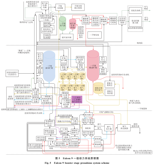 为进一步提高增压工质的利用率,以Falcon9为代表的运载火箭采用了一体化设计方案,气体工质(图5中心的8个氦气瓶)可同时参与贮箱增压、冷气姿控、发动机起动吹除、冷气分离等时序动作;箭上充气、气封、吹除等供配气管路的功能合并与共用可以进一步减少组件数量及结构质量。