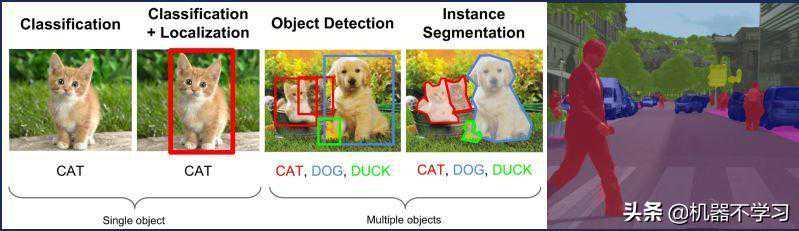 下图是从斯坦福大学李飞飞教授的一门课借鉴过来的。以小猫、小狗分类为例。它对图像到底属于哪个类别作一个区分。知道了对象的分类,进一步定位图像中对象的位置,这就是单目标识别(singleobjectdetection)。如果图片中有很多不同的对象,比如说小猫、小狗、小鸭子,称为目标识别(objectdetection)。目标识别就是把这个图片上所有的对象都识别出来。这个图片上面用不同的框子能区分出不同的对象,这样只知道对象大概在什么位置,若要精确到像素,就要作对象划分(instancesegmentation)。