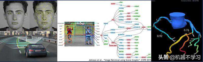 由于计算机视觉已经慢慢的趋于成熟,所以它能够颠覆的领域越来越多。基本上我们用人眼和传统的方法能够去识别的东西,计算机视觉都会逐步的改变。左图是比较常见的人脸识别,比如我们现在各种刷脸购物、刷脸进园区,这个刷脸其实就是识别(recognition),根据我们人脸的一些特征点,进行人脸匹配,就能知道是谁。