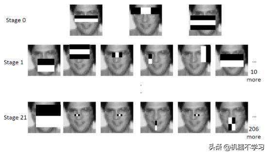 当对象边缘不清晰时,比较经典的方法是Harr特征。它是把图像上不同位置的灰度变化用黑白方框表示出来。上面两行代表垂直和水平的灰度变化,它只有上下左右四个方向。右下角对角线的方式是进一步优化的harr方法,可以表示45度方向的灰度变化。