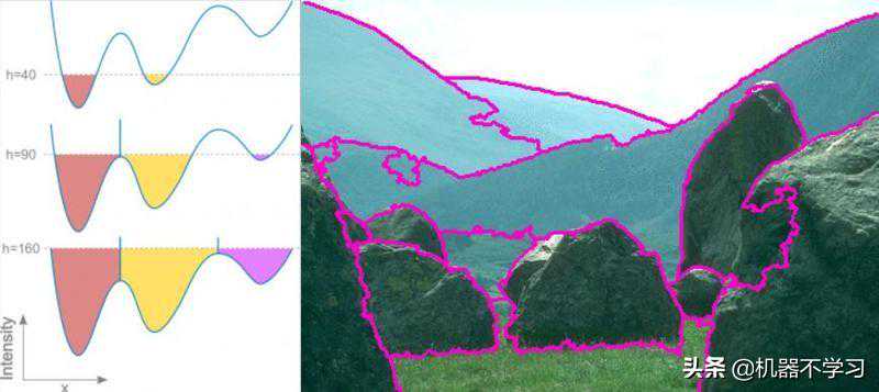 首先对整个图片进行扫描,得到灰度的曲线图。然后往灰度曲线图去灌水,自然会有两个相邻的谷底要联通,这时建个水坝,不让它们联通。然后继续贯水,直到又有两个相邻的灰度区域要连通,继续建坝。重复这个过程,最终整个曲线图上有多个水坝,每个水坝的位置其实就是边缘的划分。