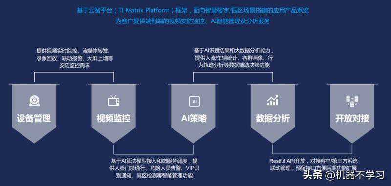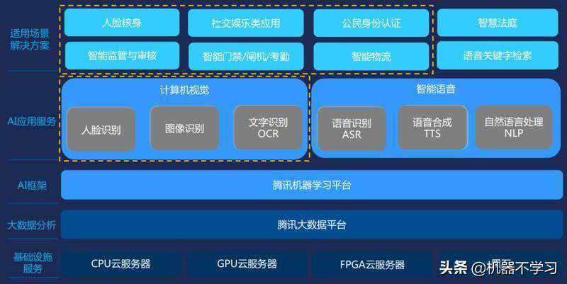下图是腾讯云的方案矩阵。大概分几个不同的领域:人脸(计算机视觉)。这个里面包括人脸和声,身份证识别,还有各种基于场景的,比如智能门禁物;语音领域,我们也有ASR(语音-文字)和TTS(文字-语音)的能力。底层有机器学习的平台和大数据的平台去支撑。基础建设就包括我们刚才提到的CPU、GPU,还有FPGA的各种服务器。