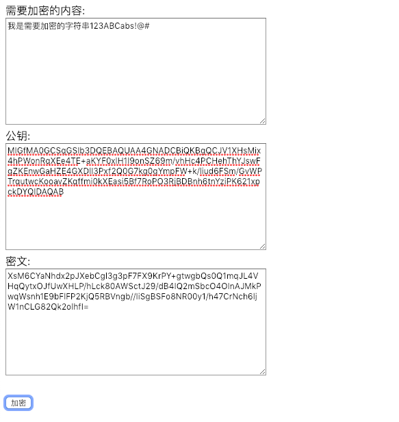 !/titlemetaname="keywords"content="keyword1,keyword2,keyword3"metaname="description"content="thisismypage"metaname="content-type"content="text/html;charset=UTF-8"scriptsrc="${}/js/"/scriptscriptsrc="${}/js/?v=123"/scriptscriptsrc="${}/js/?v=321123"/scriptscripttype="text/javascript"$(function(){$('msg').val();//公钥varpublickey=$('ecodeMsg').val(ecodeMsg);});});/script/headbody需要加密的内容:/brtextareaid="msg"name="msg"rows="10"cols="60"/textarea/br公钥:/brtextareaid="publickey"rows="10"cols="60"/textarea/br密文:/brtextareaid="ecodeMsg"rows="10"cols="60"/textareabr/br/inputid="submit"type="button"value="加密"//body/body/html简单的测试,页面获取密文