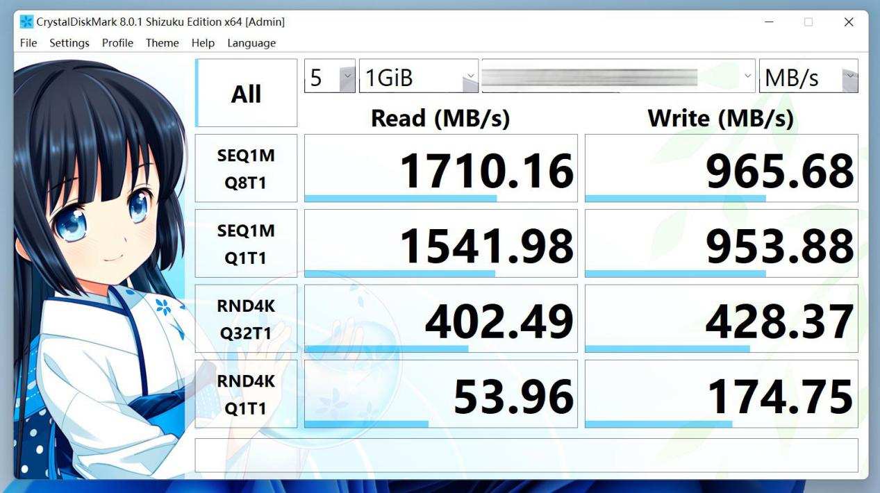 CrysatlDiskMark:读取1710.16MB/s、写入965.68MB/s。