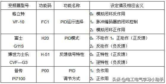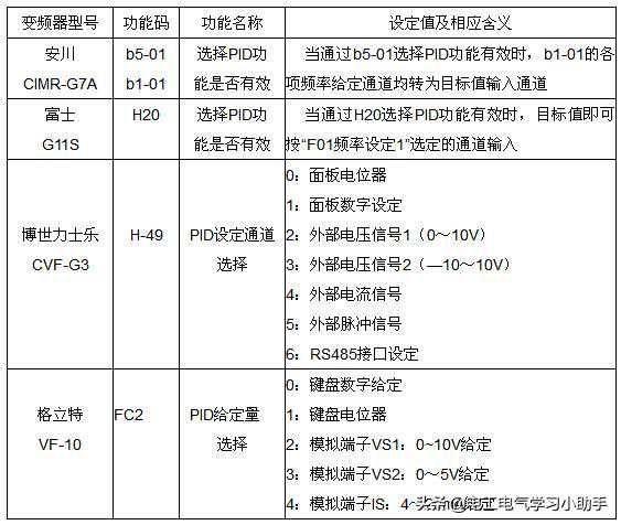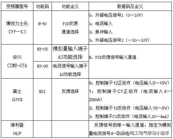实现变频器的闭环控制,对于目标信号来说,有两个问题需要解决,一是选择将目标值(目标信号)传送给变频器的输入通道,二是确定目标值的大小。对于第一个问题,各种变频器大体上有如下两种方案。一是自动转换法,即变频器预置PID功能有效时,其开环运行时的频率给定功能自动转为目标值给定,如表1中的安川CIMR-G7A与富士G11S变频器。二是通道选择法,如表1中的博世力士乐CVF-G3与格立特VF-10系列变频器。