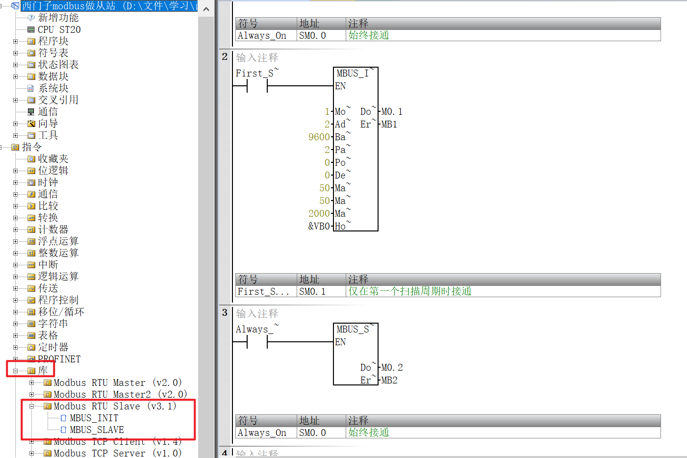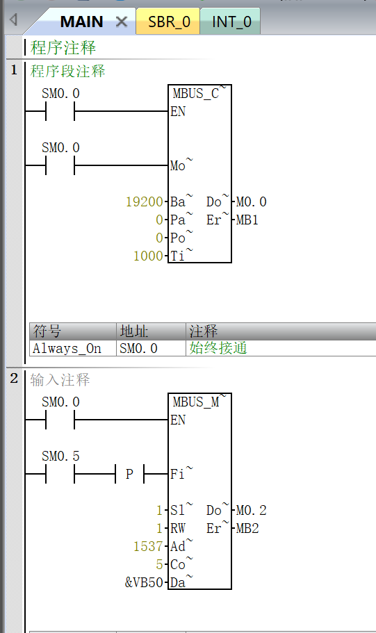 西门子SMART200做主站需要写程序,先写初始化程序MBUS_CTRL,再写读写指令MBUS_MSG。存储器地址分配按照建议来即可。