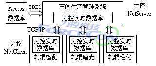车间管理系统向机床下达工作任务的实现原理如下图所示,通过组态软件提供的开放数据库互连(opatabaseconnectivity,英文简称ODBC)接口与Access数据库互连,将工作任务信息从数据库中读出,然后通过力控组态软件的网络应用程序NetServer和NetClient实现车间管理系统和机床监控系统两个系统的实时数据库共享,将工作任务传达给电火花毛化加工机床及其它机床。