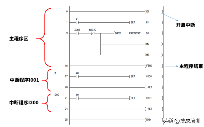 如下图,是一段程序,有一段主程序,还有2段中断程序I001和I200。假如只有主程序,那么程序结尾就需要一个END指令就可以,如果别别的程序,就需要和下图一样,在主程序区尾端假如一行FEND,主程序结束指令,把主程序和其他程序区分开。