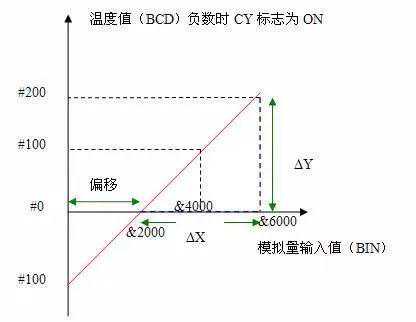 条件:欧姆龙PLC变送器的输出信号为0-10V,对应温度为-100--200摄氏度;CP1H的模拟量输入量程设置为0-10V,分辨率选择6000