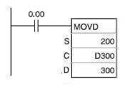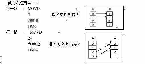 操作数排列如图1,S是源字,也就是用模拟量输入的通道,DI是指定数位号,每个数字指定方式如上图2,也就是指定从源字中哪一个数字开始传送(一个通道是4个16进制数字,一路输入是半个通道,也就是2个16进制数字),传送几个数字,传送到目标通道的哪个数字,D就是指定目标通道。例如现在MAD02的第一第二路输入的通道是002通道,现在要把第一路数据传送到DM0,第二路数据传送到DM1,MOVD指令
