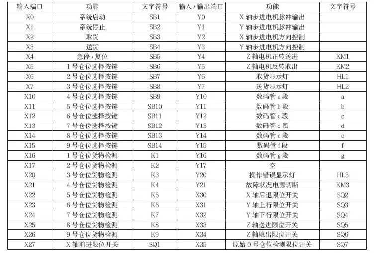 根据任务书对自动化立体仓库的输入输出控制要求,得出如下PLC输入输出I/O口分配表1:
