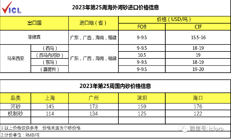 ConstructionSands建筑砂2023/06/19ICL建筑砂海外市场动态【价格信息】进口河砂1.菲律宾:10000吨出口日本,暂无出口中国计划2.马来西亚:基本上本地供应,无出口计划3.截......