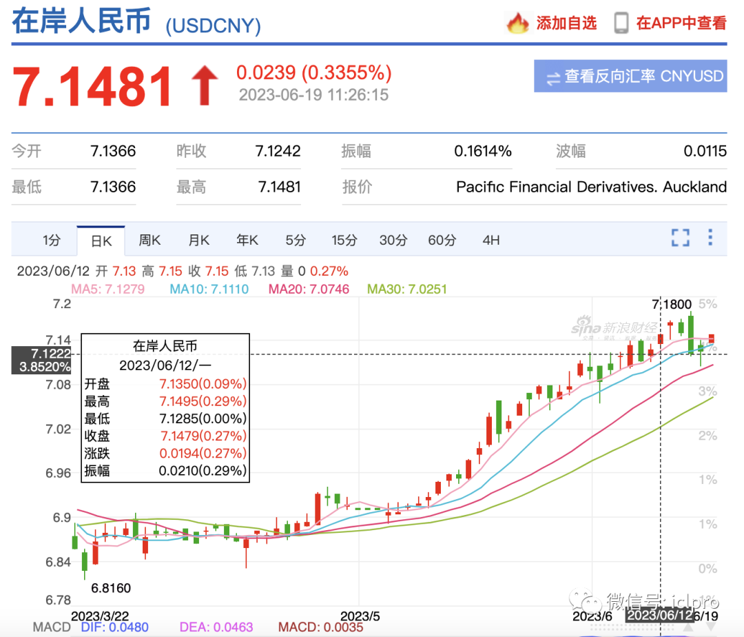5.本周在岸人民币对美元汇率基本持平,截止6月19日,在岸人民币对美元汇率报7.1474,同比上周一收盘价7.1479,基本持平
