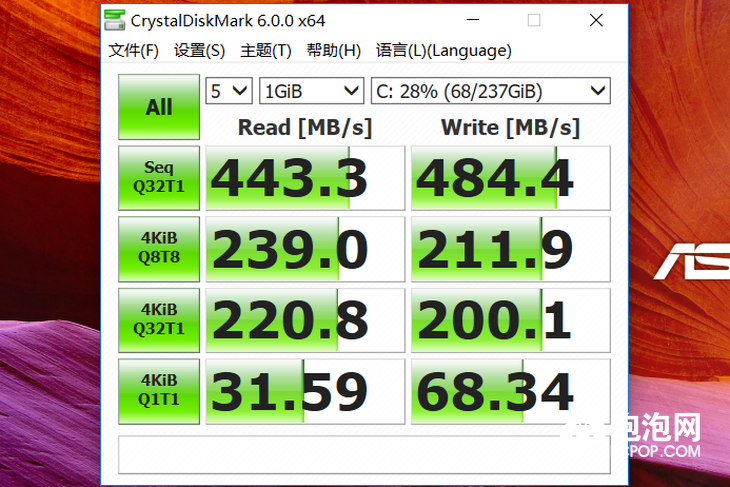 华硕顽石热血版YX570ZD配备了一块来自闪迪的256GBSSD,使用CrystalDiskMark进行测试,其拥有443.3MB/S的读取速度以及484.4MB/S的写入速度,4KQ32的读写速度分别为220.8MB/S和200.1MB/S。整体的表现主流,可以充分满足日常应用的需求。