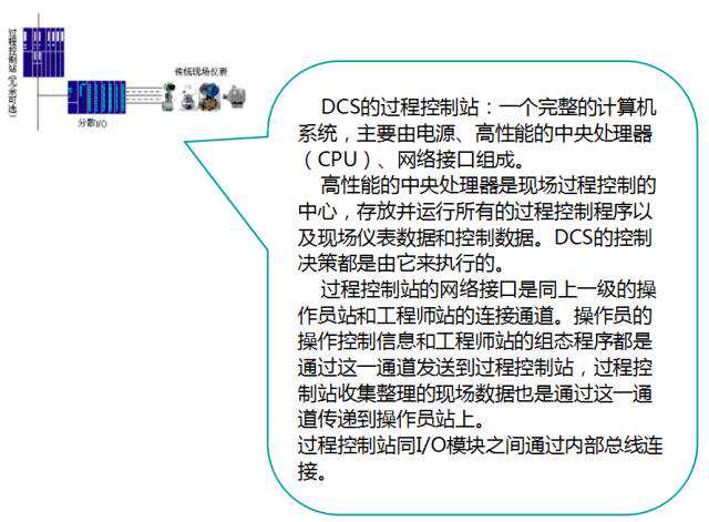 DCS通常采用若干个控制器(过程站)对一个生产过程中的众多控制点进行控制,各控制器间通过网络连接并可进行数据交换。