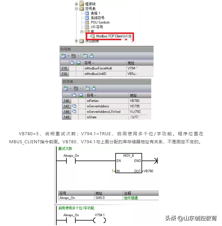 打开“符号表”→“库”→“ModbusTCPClient”,找到对应的mRetries和mModbusForceMulti对应的存储器地址。
