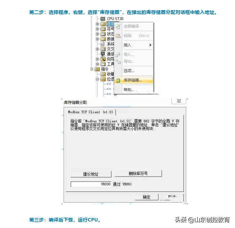 第一步:在主程序MAIN中调用“指令”→“库”→“ModbusTCPClient”→“Mbus_Client”。