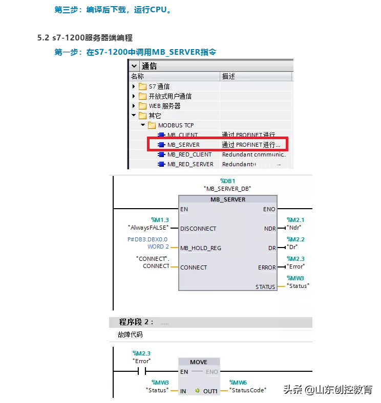 MB_HOLD_REG:指向“MB_SERVER”指令中Modbus保持性寄存器的指针,引用的存储区必须大于两个字节,可以将全局数据块(优化访问或不优化)或者位存储器映射成Modbus保持寄存器。Modbus客户端通过Modbus功能码3(读取)、6(写入单个寄存器)、16(写入单个或多个寄存器)和23(在一个作业中读写)可访问的值。