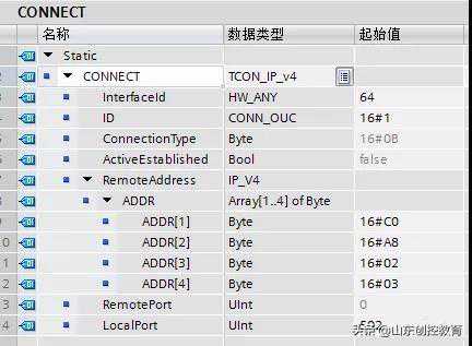 CONNECT:指向连接描述结构的指针,s7-1200的类型为TCON_IP_v4。本例中创建的数据块名称为“CONNECT”,打开数据块,在数据块中创建TCON_IP_v4类型的数据。如下图: