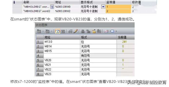 在s7-1200的“监控表”中,把“MB_HOLD_REG”输入参数对应的DB3第一个和第二个数据分别写入1、2。