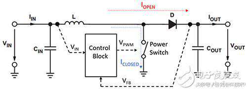 当施加VIN电压且电源开关关闭时,电流沿着蓝色路径,通过电感器流到地。电感器将电能存储在其磁场中。二极管反向偏置,随着其存储的电能供应给负载,输出电容器两端的电压降低。