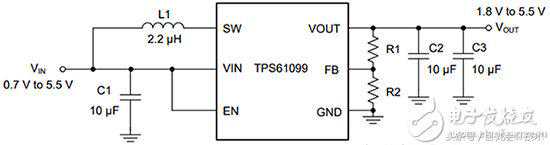TexasInstruments提供的TPS610993YFFT就是低功耗升压稳压器的一个例子(图2)。这是一种同步器件,其静态电流仅1µA,但能提供高达800毫安(mA)的电流,并在低至0.7伏特的输入电压下产生3.0伏特的输出电压。该器件的设计目的是在轻负载条件下最大程度地提高工作效率。它可与碱性电池或充电电池(例如NiMH电池或锂离子电池)配合使用。