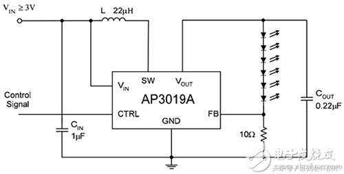 该器件专门针对空间受限的应用进行了优化,内部包括电源开关和二极管,开关频率为1.2MHz,允许使用微型外部元器件。AP3019A采用SOT-23-6封装,能够提供高达550mA的电流。