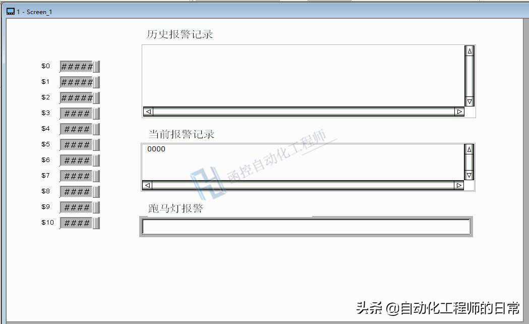 依照以上设置完成后。开启软件仿真,当在地址$0中设置为1时,“历史报警记录”、“当前报警记录”和“走马灯报警”中马上就输出了报警信息,如下图所示;