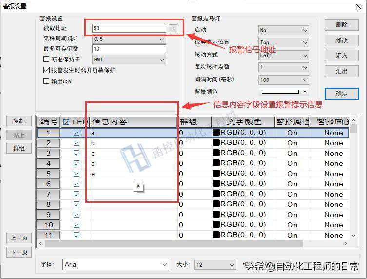 “报警设置”对话框中,在“报警地址”-“读取地址”中设置为$0(因为我们没有使用实物连接,通过仿真展示,故使用内部地址)。即,报警信息均从地址$0中读取。在“信息内容”字段中,设置报警的提示信息。即,需要显示到界面给操作人机的具体内容。