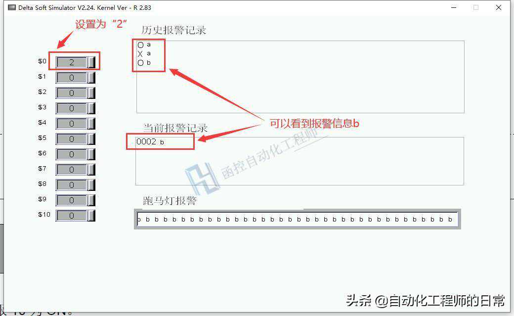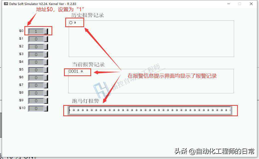 以上的测试过程中,设置的报警信息参数都是以1、2、4这样的数据,第三个信息c的设置数据为4,那为什么不设置为3呢?其实,报警信息是按照位来进行读取的,也就是说,虽然报警信息读取地址设置位$0,但实际的报警信息是依照从设置地址的位开始读取的。按照8421码的编码方式,数据1是第一位、数据2是第二位、数据4是第三位、数据8是第四位……