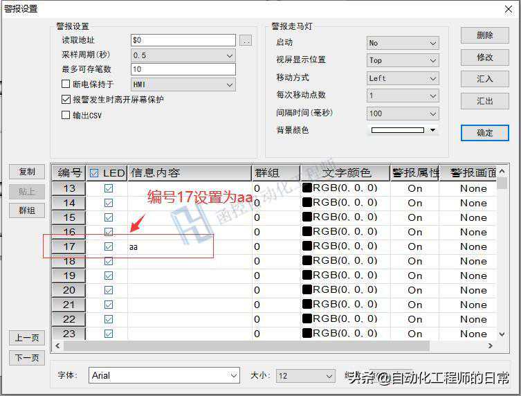 如下,在“报警设置”对话框中,设置编号17的信息内容为aa。