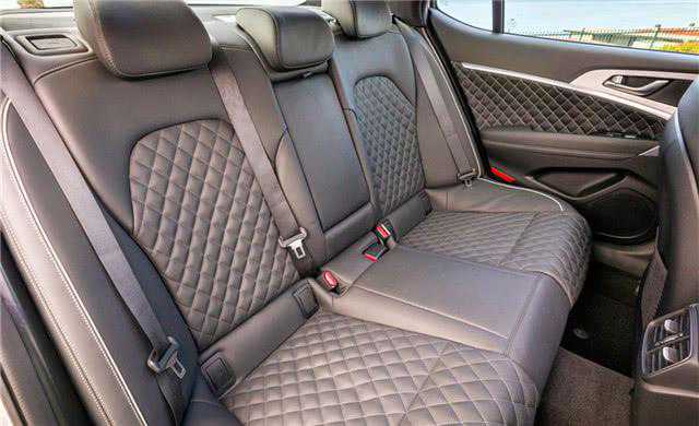 G70定位于运动型B级车,虽然轴距有2米8多,但后排空间跟主打行政或家用的B级车比还是逊色一些。无论是腿步空间还是头部空间都一般,只能说够用。中间底部凸起也比较高,更适合两个人乘坐。当然,后排配置还是不错的,空调出风口跟充电接口都有配置,座椅椅垫非常宽厚,材质依旧为真皮,做工缝线都非常不错,三个座位都配置了头枕。