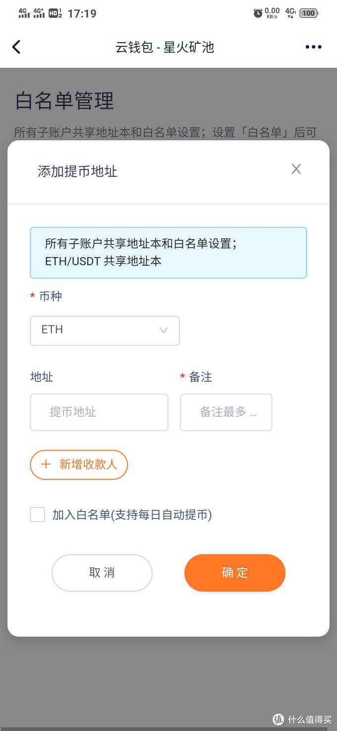 地址里填中间钱包imToken的地址,外面分账比例设置100%,这样当矿池挖满0.1个ETH达到最低自动提币阈值,就会在每天3点以后自动向白名单内的中间钱包地址转币。