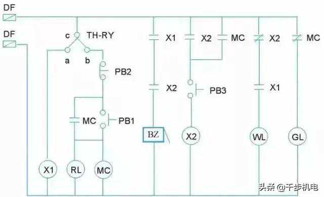 4、电动机在运转中,因过载或其它故障原因,致使积热电驿th-ry动作,电动机停止运转,蜂鸣器bz发出警报,指示灯rl熄,绿灯gl亮。