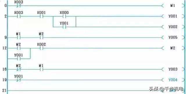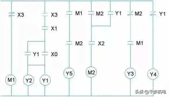 1、将电工图中控制电路直接转成对应阶梯图。因为plc阶梯图中规定,接点在前,输出线圈则必须位于回路的最后。故首先须重新绘制电工图,将图中接点与输出线圈位置适度变更,以符合plc阶梯图的要求,重新绘制后的电工图,如图3所示。