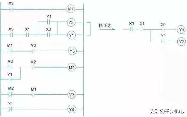 b.输出线圈y1和y2,不符合一般编程软件格式,故须适度更正,如图5右方所示。