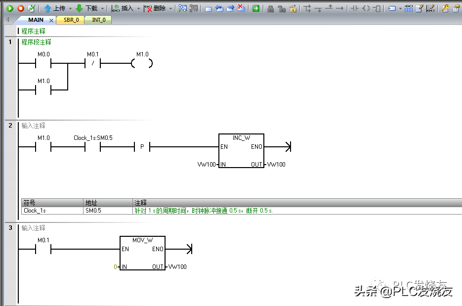 程序段二:用启保停线圈的常开触点来触发(0.5秒脉冲)—沿脉冲(上升沿)—INC_W(自加一指令)IN:VW100OUT:VW100。