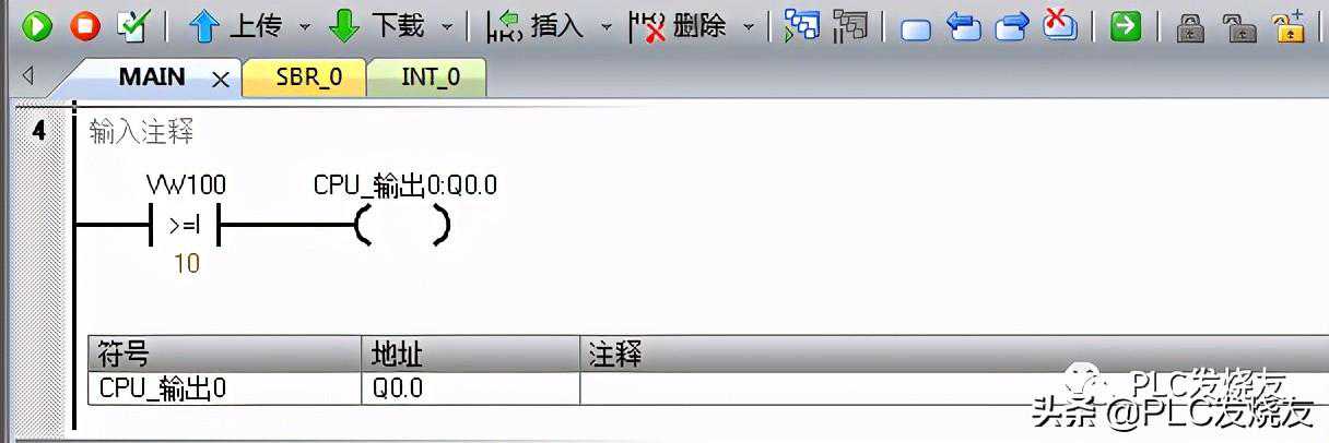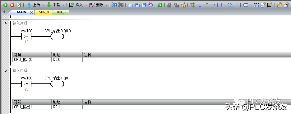 程序段四:用比较指令大于等于整数来比较VW100数值10来触发线圈。