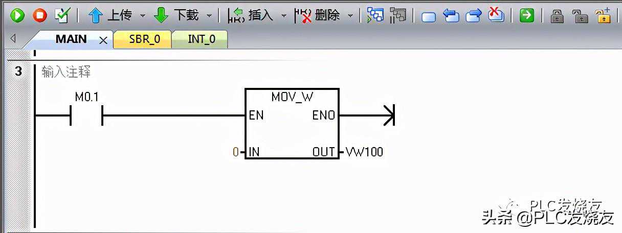 程序段三:用启保停程序中停止按钮常开触点来触发MOV_W传送指令,IN:0OUT;VW100。