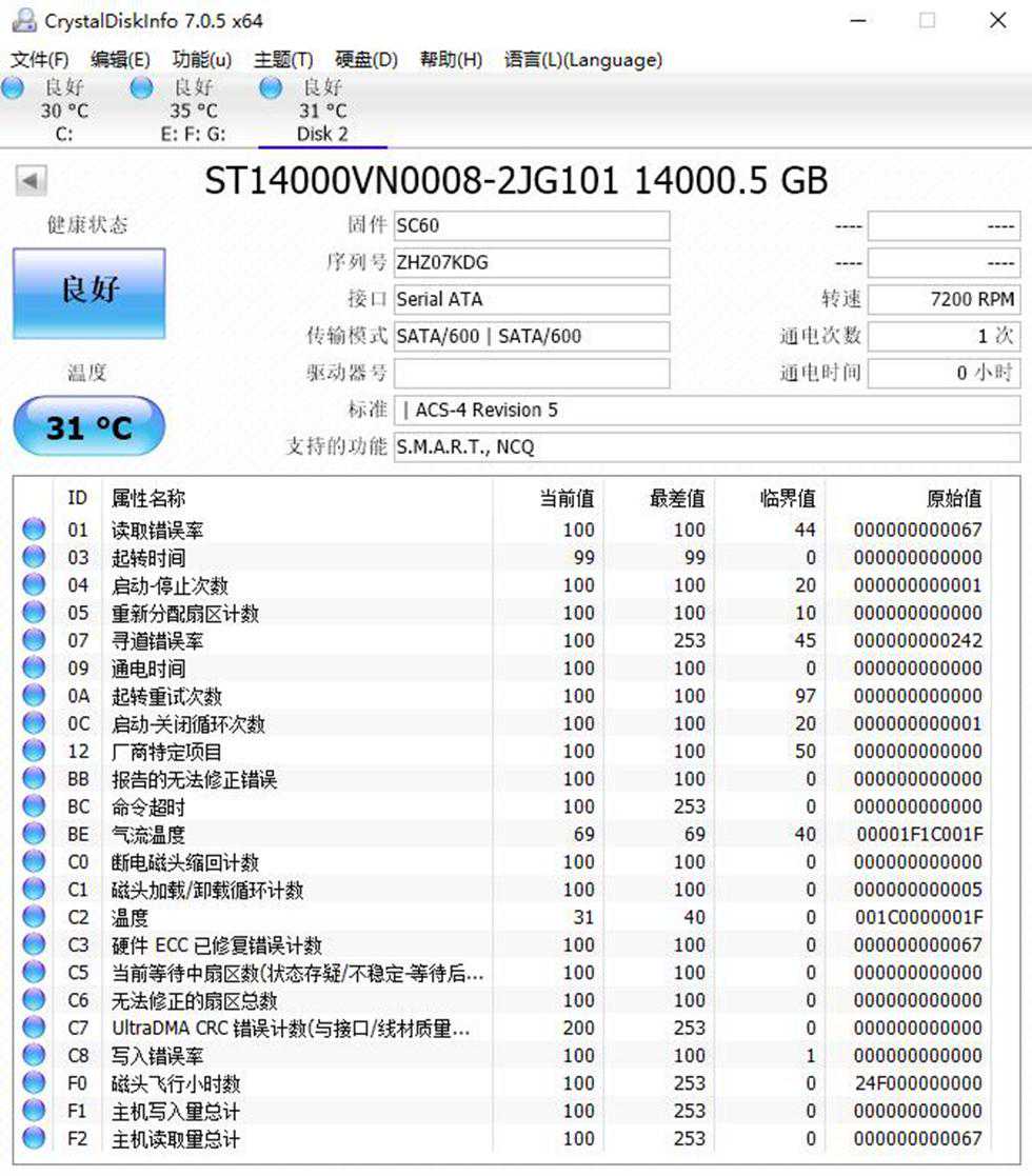 CrystalDiskInfo读取到的14T酷狼硬盘信息,盘片转速:7200RPM,通电次数1,通电时长0小时,全新盘,裸盘温度31°C。