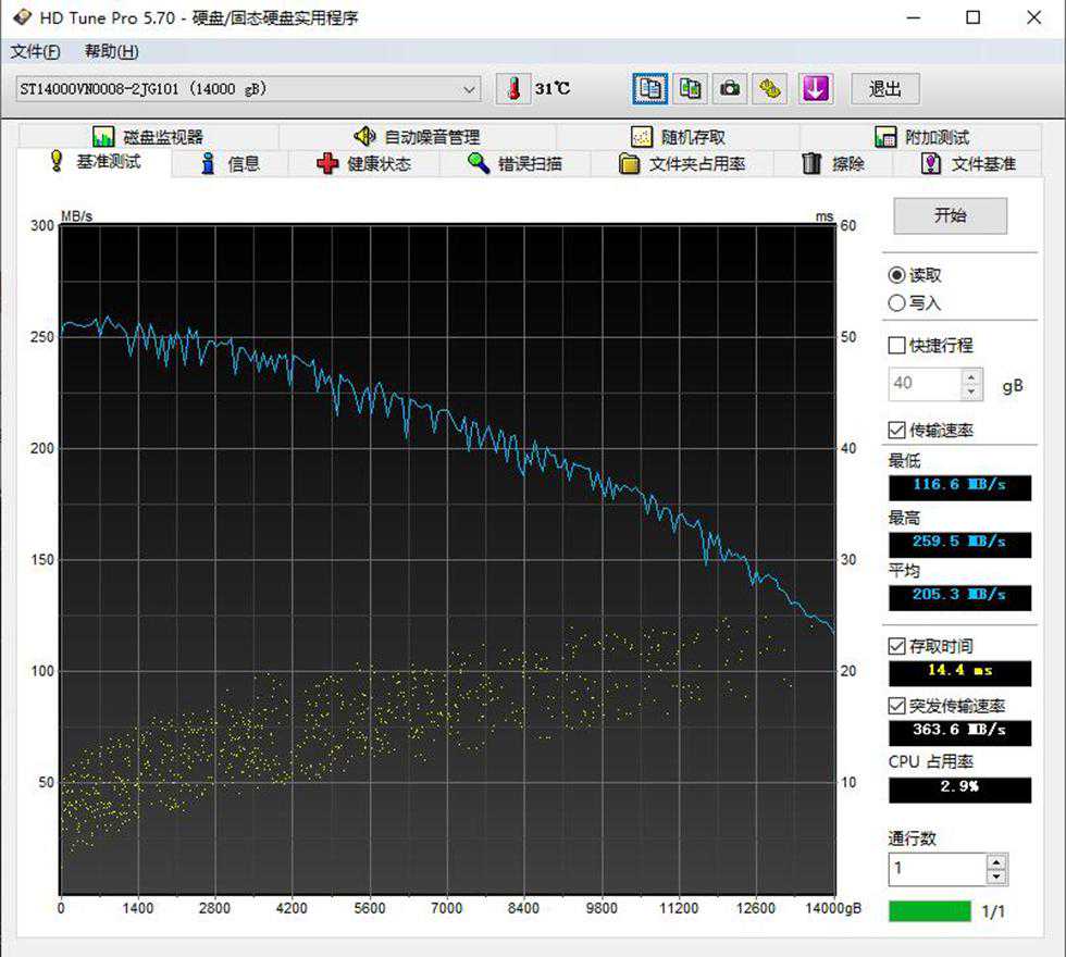 在HDTune读取测试中,14TB的酷狼最低读取速度为:116.6MB/s,最高读取速度为:259.5MB/s,平均读取速度达到了:205.3MB/s左右,存取时间:14.4ms。