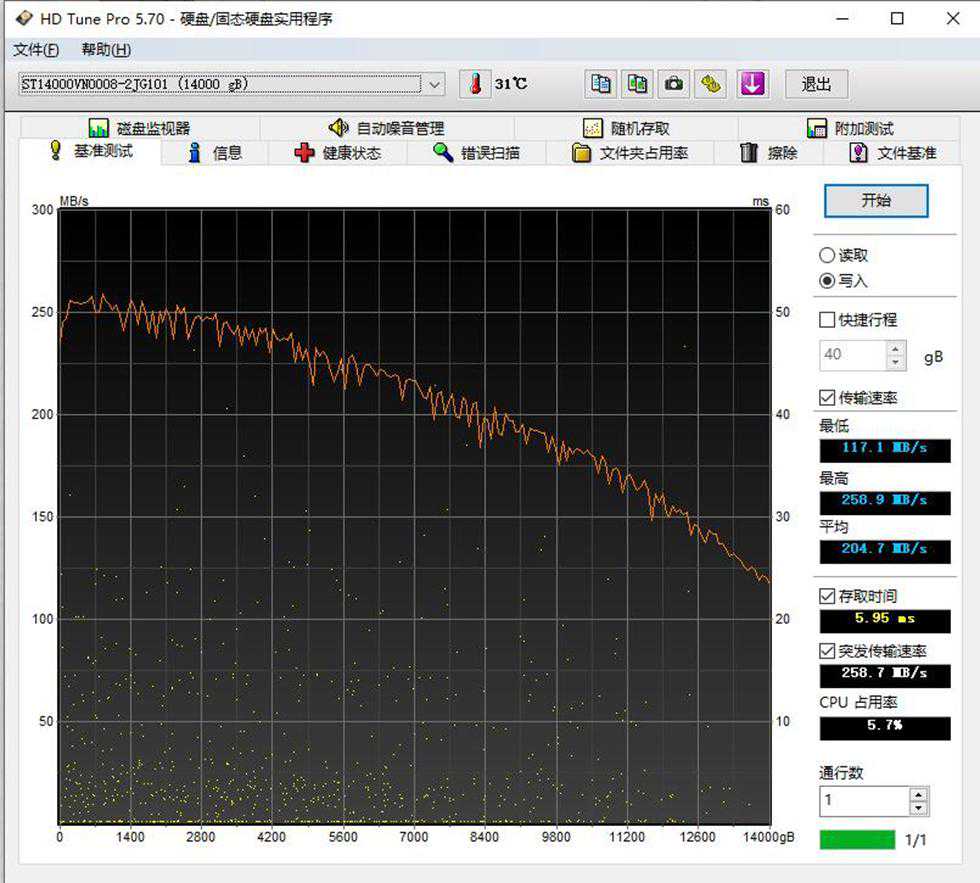 在HDTune写入测试中,14TB的酷狼最低写入速度为:117.1MB/s,最高写入速度为:258.9MB/s,平均写入速度达到了:204.7MB/s左右,存取时间:5.95ms。