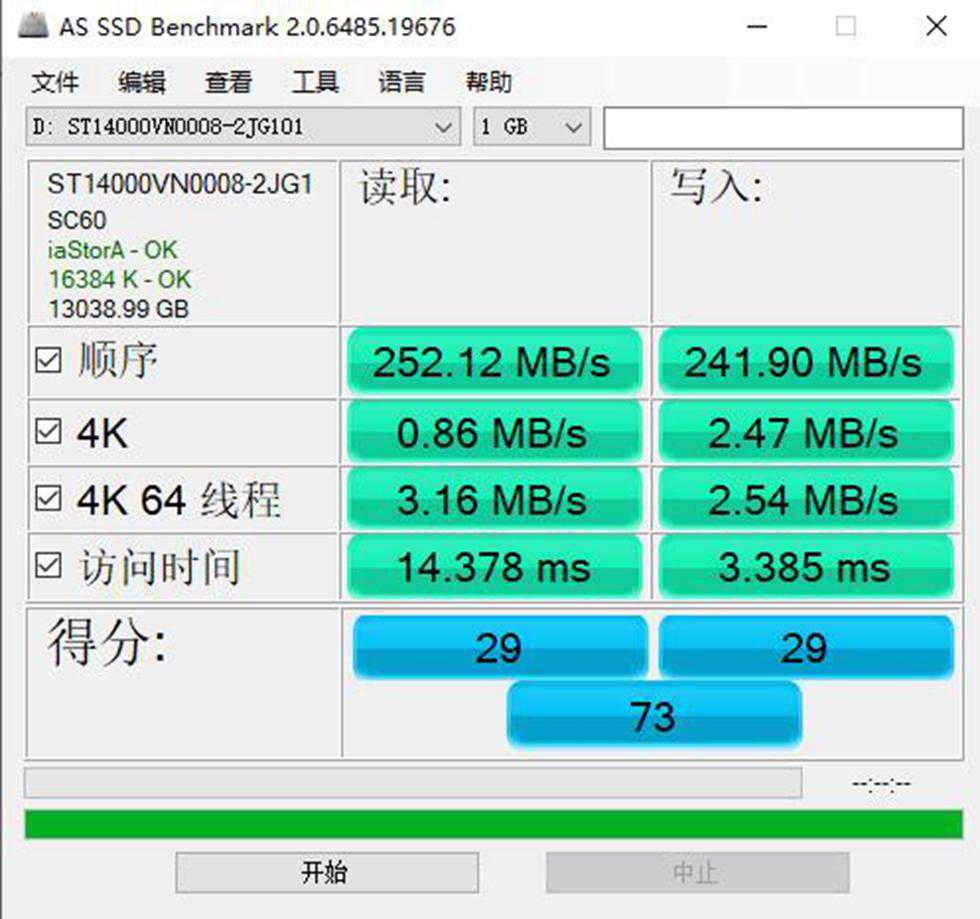 ASSSDBenchmark测得14TB酷狼连续读写速度分别为:252.12MB/s和241.90MB/s。