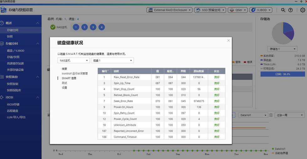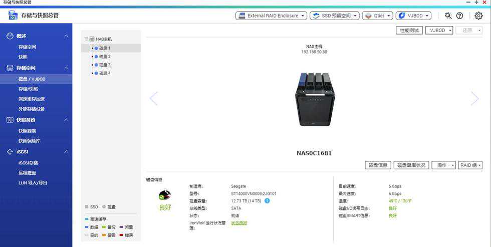 以威联通的QNAPTS-453Bmini为例,打开存储与快照总管,在磁盘/VJBOD选项中可以看到每一块盘都有一个标志性的“狼头”显示,这个是只有希捷酷狼系列的盘才有的,其它系列是没有的。