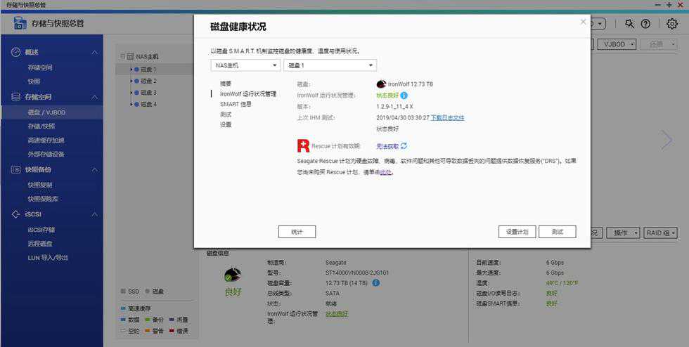在磁盘健康状况选项下,可以自行设置温度警报、SMART测试计划、IronWolf运行状况管理等,可每次手动测试也可以制订计划定时测试,图中可以清晰的看到每块盘的健康状况,而酷狼Pro系列盘还可以获得希捷官方提供的Rescue服务,此次测试的酷狼并不包含Rescue服务,所以图中红色的“R”标志后显示无法获取,当然也可以自行选购Rescue服务,一年大概90元左右,对于数据存储安全性要求严苛的个人和企业,这个服务还是挺值当的。