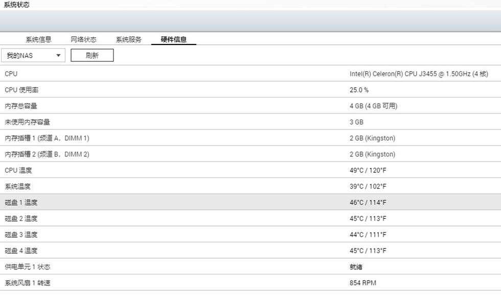 NAS正常运行时的功耗为38.1W左右,比待机时高出了8W左右,硬盘运行时平均功耗官方给出的数值是7.9瓦,如此算来,也是基本吻合的正常值。