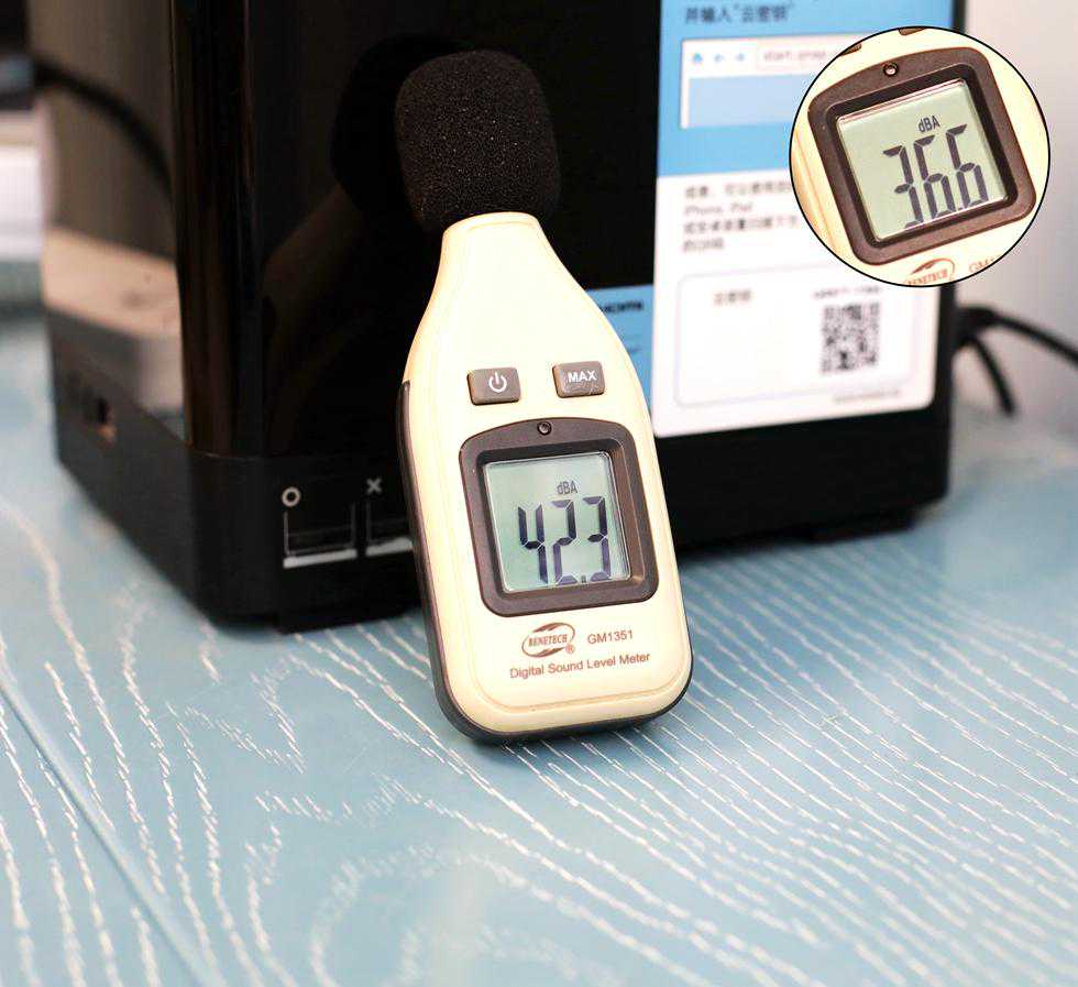 家用NAS的噪音还是相当重要的一个指标,毕竟不绝于耳的“咔咔咔”声,会让人抓狂,入夜时分的郊区,相当安静,环境噪音才36dBA左右,此时搬出噪音计,贴着NAS靠放,待机时还是比较安静的,偶尔也会听到一两声磁盘转动的声音,不过声音比较小,不是隔太近,基本可以忽略,待机时的噪音大概在40dBA左右。