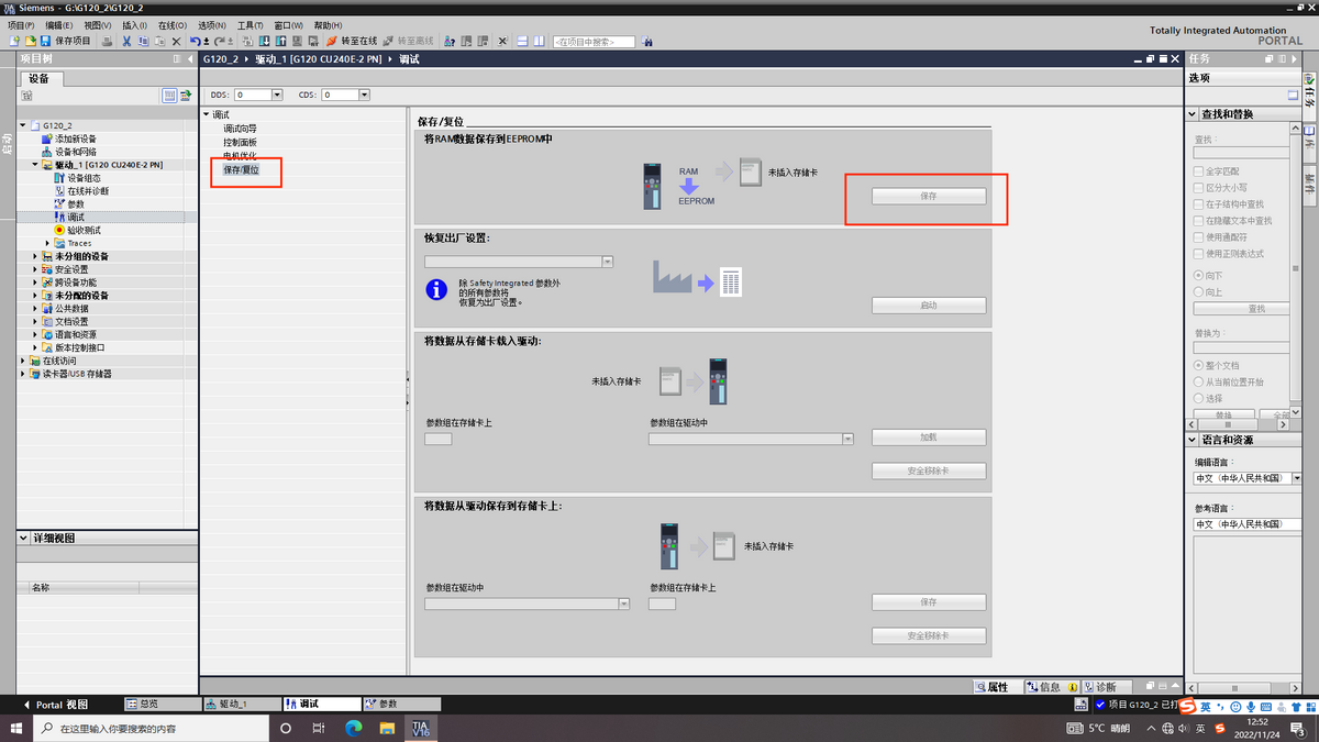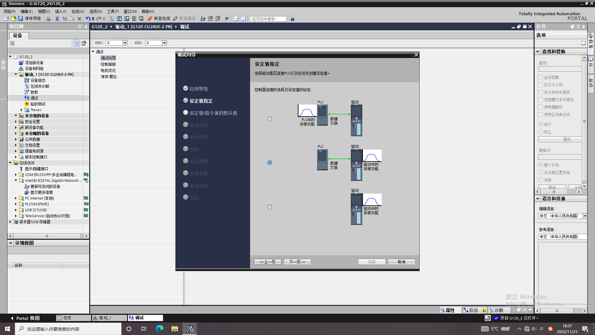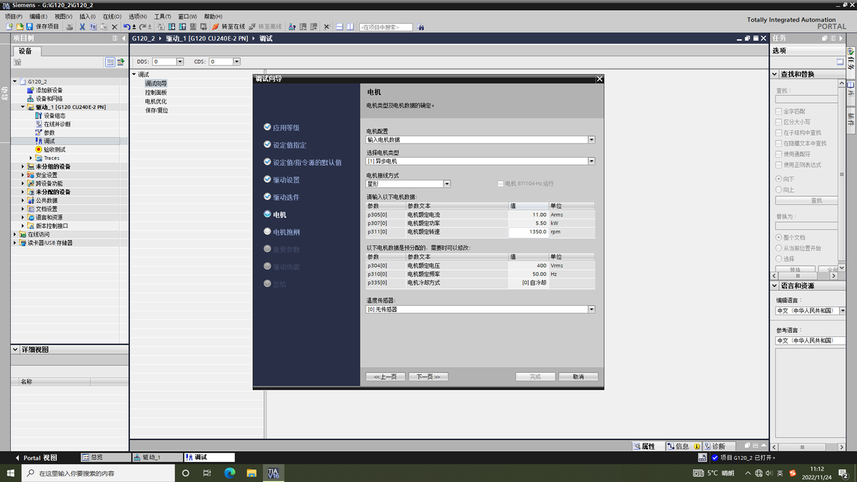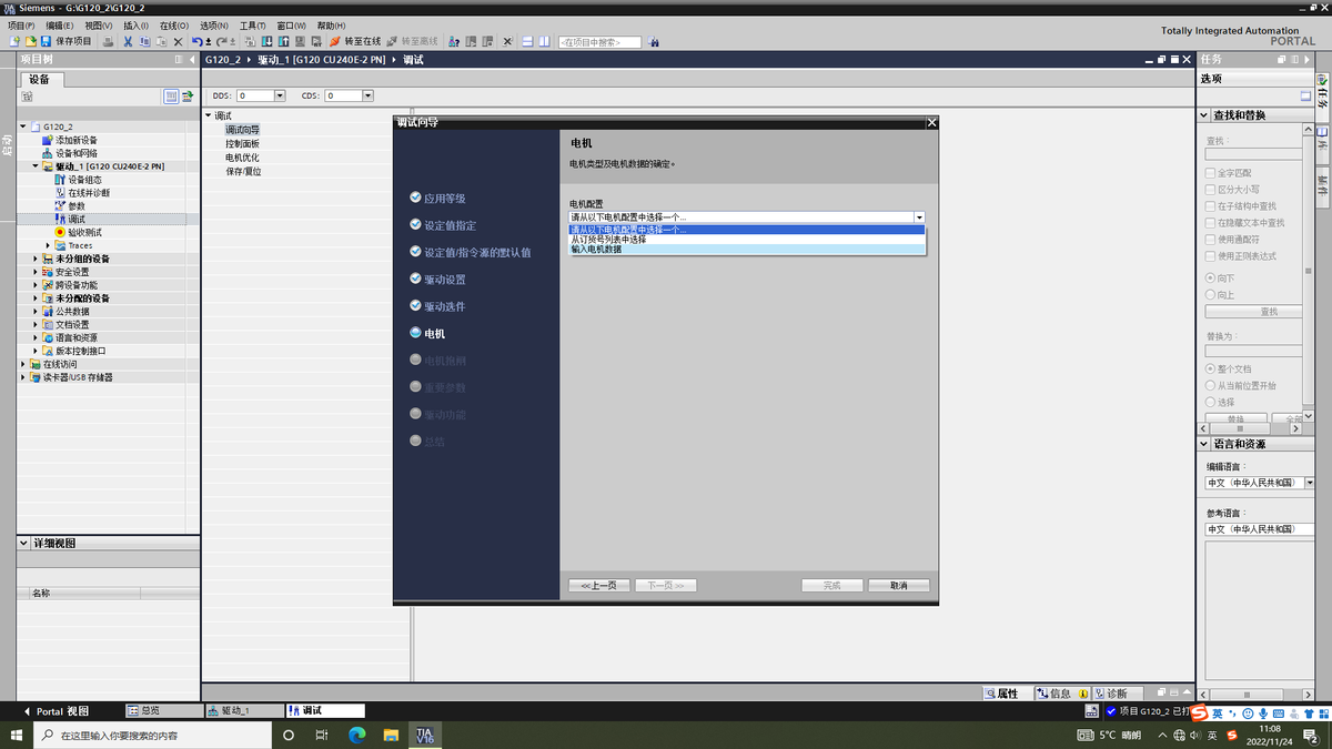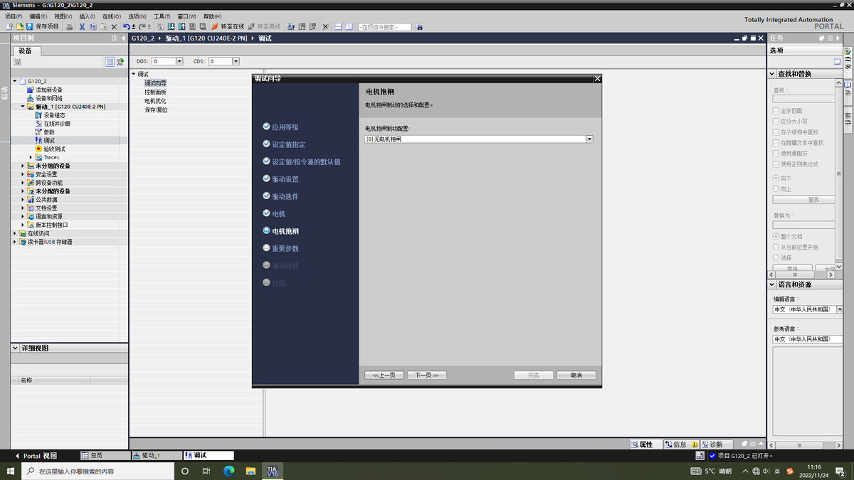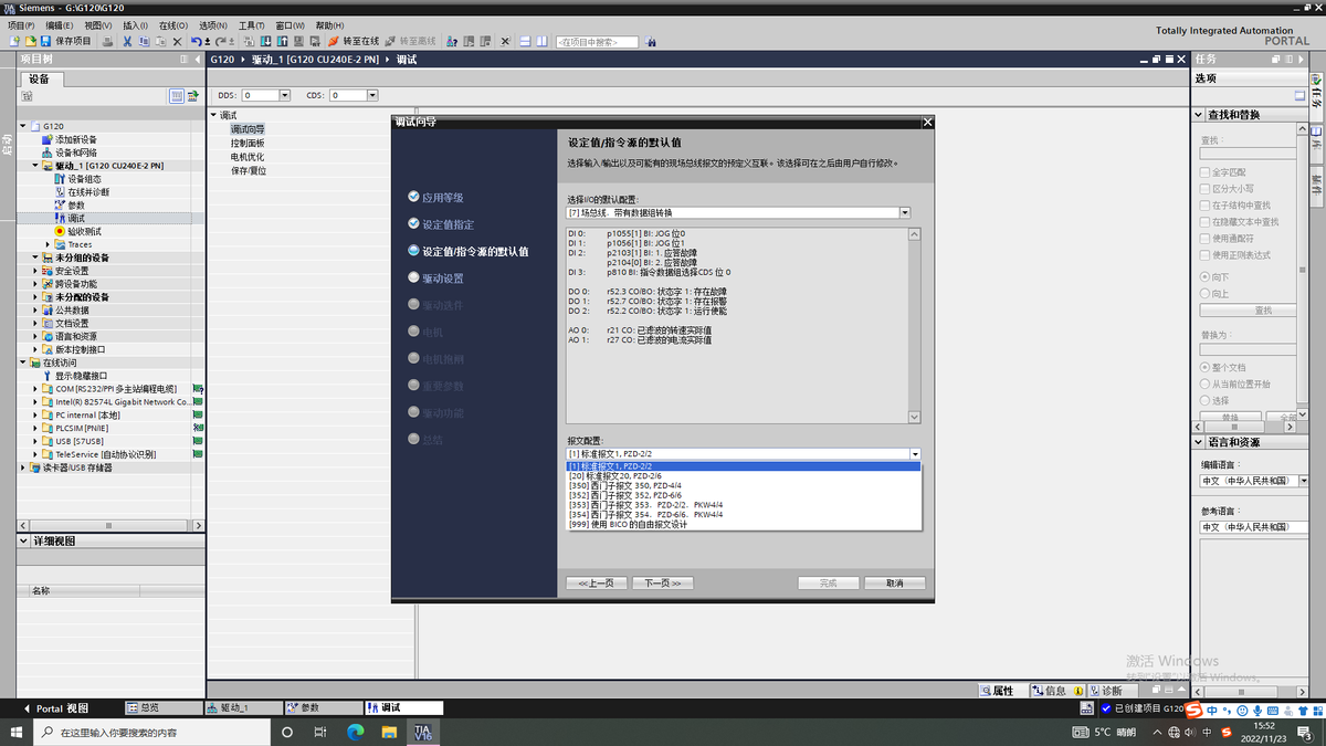 打开设备树双击调试,点开调试向导进行变频器配置。选用的控制单元CU不同可能以下页面有所差异,CU250S-PN可接编码器,现在已CU240E-PN为例介绍。