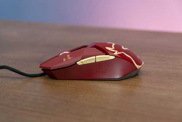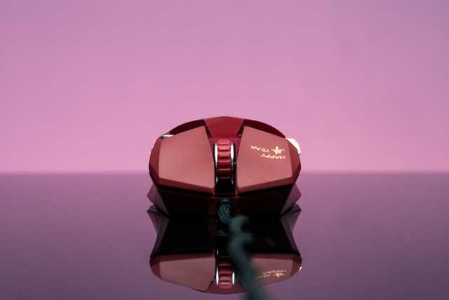 达尔优A970的尺寸为131,如上文所述外壳为对称设计。牛年特别版的外壳一改普通版沉闷的全黑配色,鼠标转为更具传统喜庆节日色彩的金、红撞色,红色的外壳搭配金牛花纹和金色侧键,鼠标一下子变得活泼了起来。