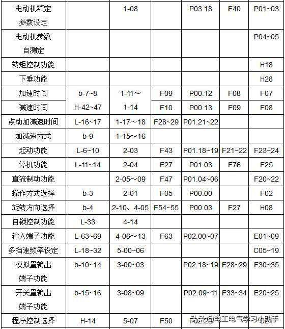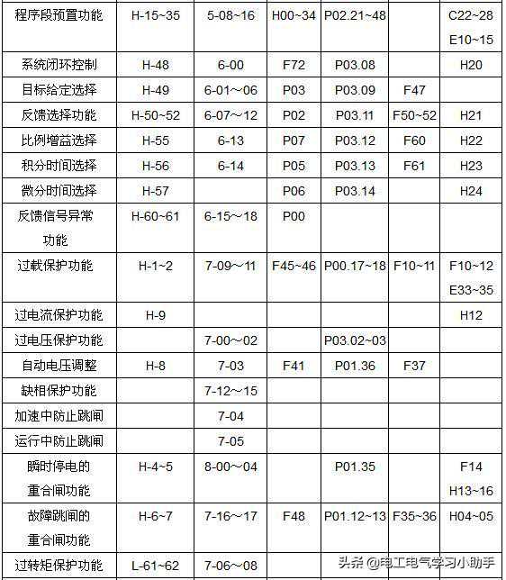 变频器的功能参数很多,通常有上百个,甚至几百个。为了调试和设置方便,有的变频器将自己的参数分成几个组,例如,基本功能参数组,辅助功能参数组,高级功能参数组,等等。每种变频器的参数分组方法、分组数量、分组名称各不相同。详细情况可查阅产品说明书。附表是几种低压变频器的功能参数代码表。